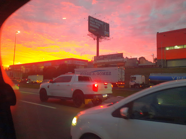 Dawn is breaking spectacularly as we weave our way through the morning traffic. It cheers me up a treat.
